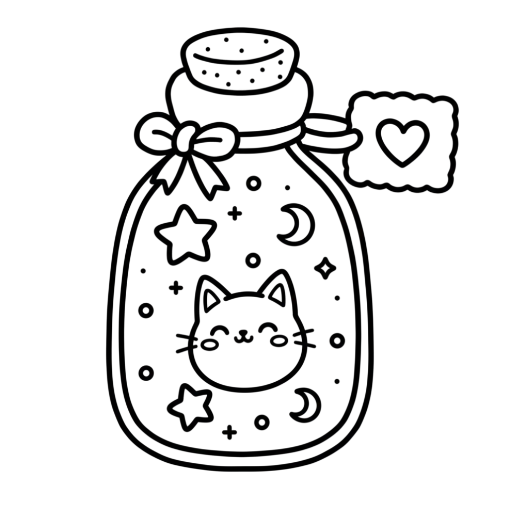 Add some whimsy to your day with this free printable cat-in-a-bottle coloring page, downloadable in SVG, PDF, and PNG formats. This enchanting design features a cute kitty surrounded by sparkles, stars, and magical details, making it a delightful activity for kids and fantasy fans.