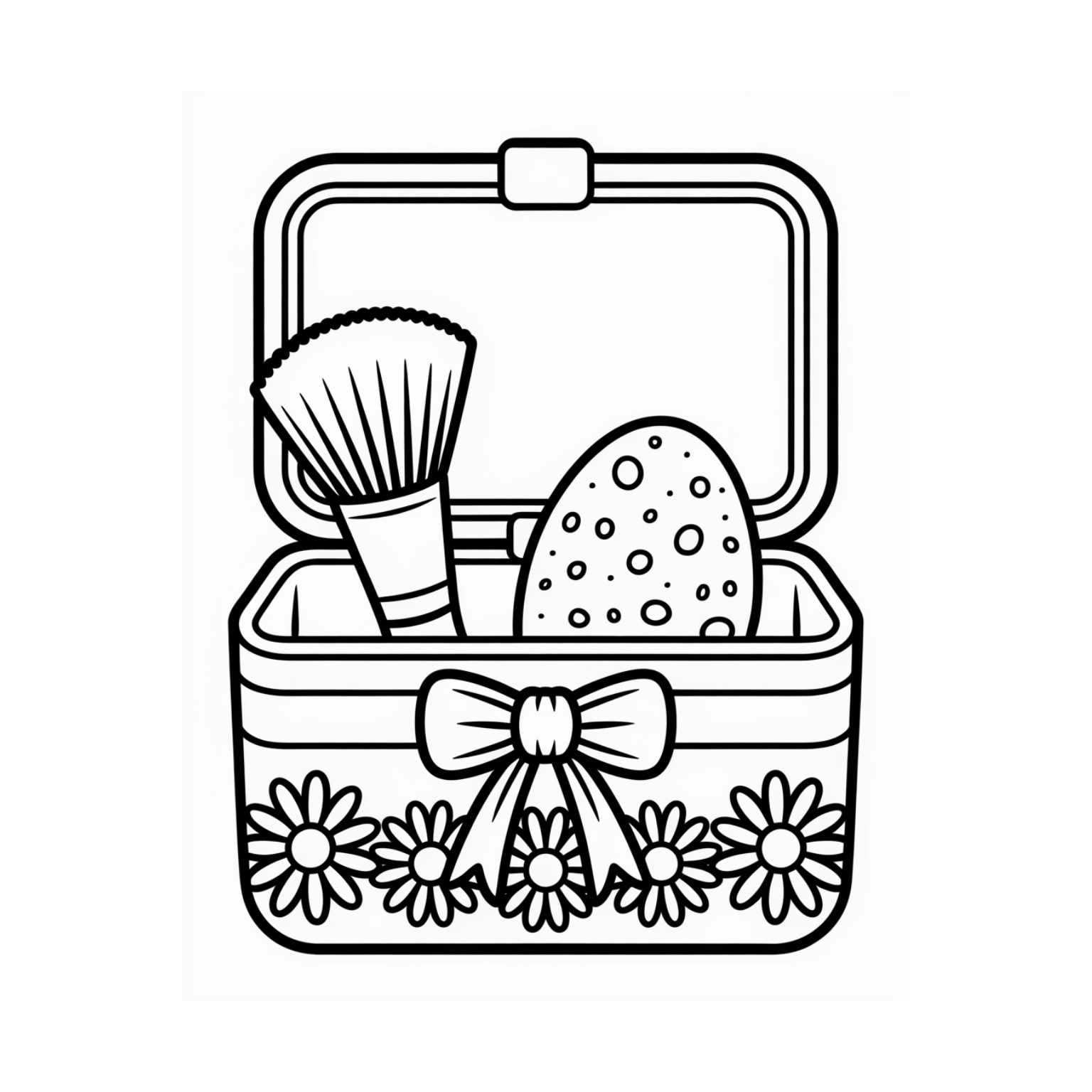 Cosmetic box coloring page in SVG, PDF, and PNG. A decorative box with a brush, sponge, and makeup items inside.