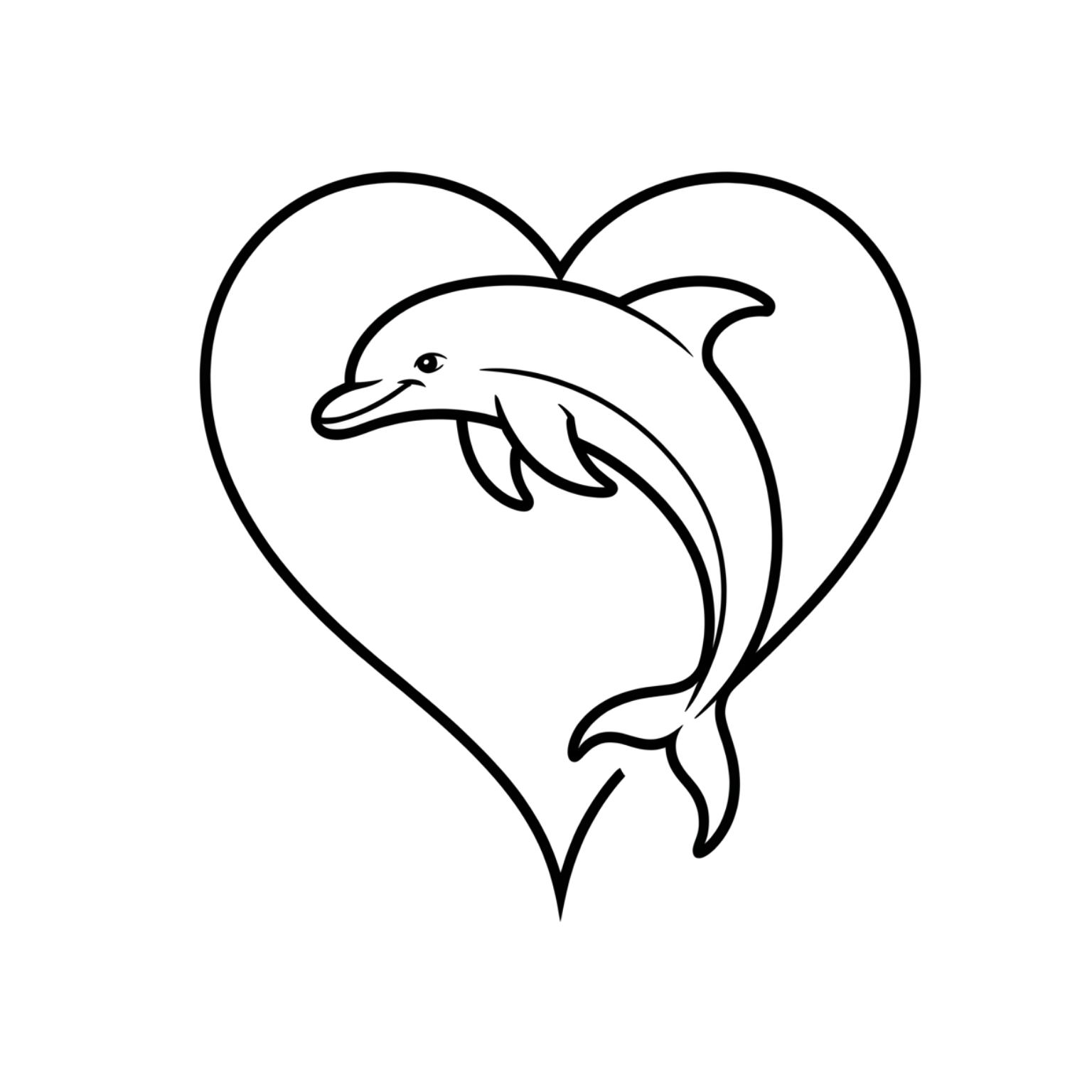 Dolphin in heart coloring page in SVG, PDF, and PNG. A playful dolphin inside a heart shape, great for ocean lovers.