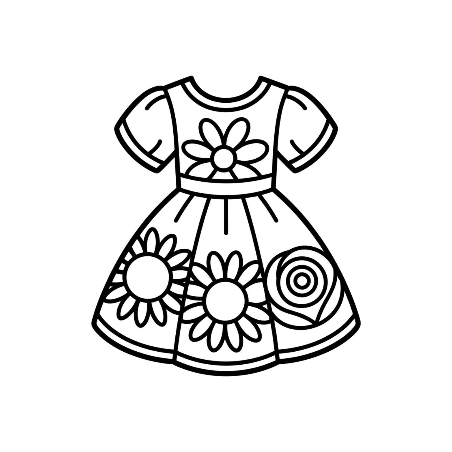 Floral dress coloring page in SVG, PDF, and PNG. A short dress decorated with bold flower patterns for a cheerful design.