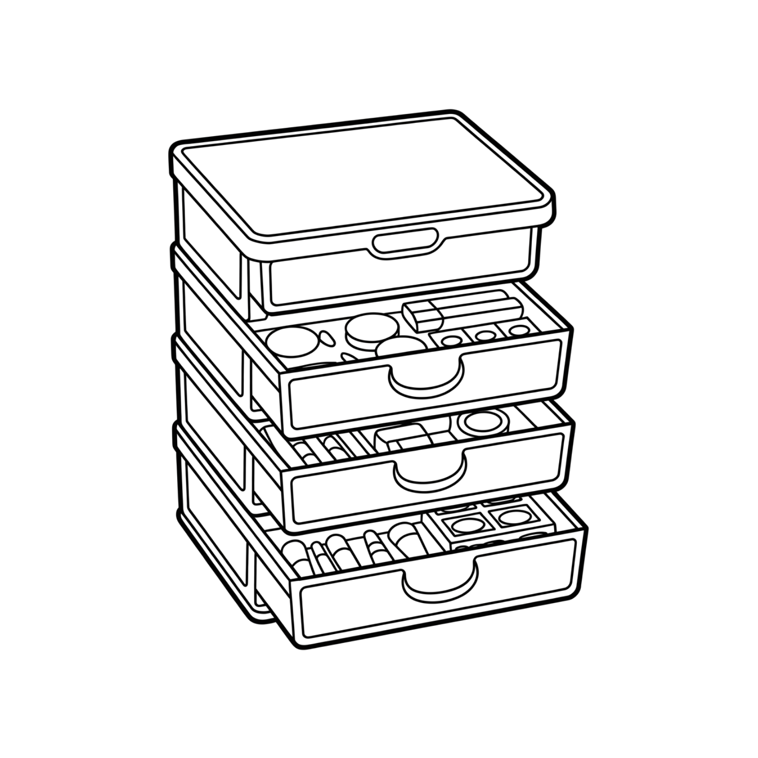 Makeup drawer coloring page in SVG, PDF, and PNG. A storage case with organized compartments full of cosmetics.