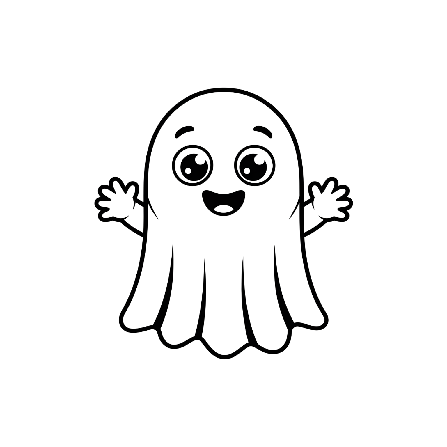 Smiling ghost coloring page in SVG, PDF, and PNG. A happy ghost with wide eyes and open arms, easy and fun for kids.