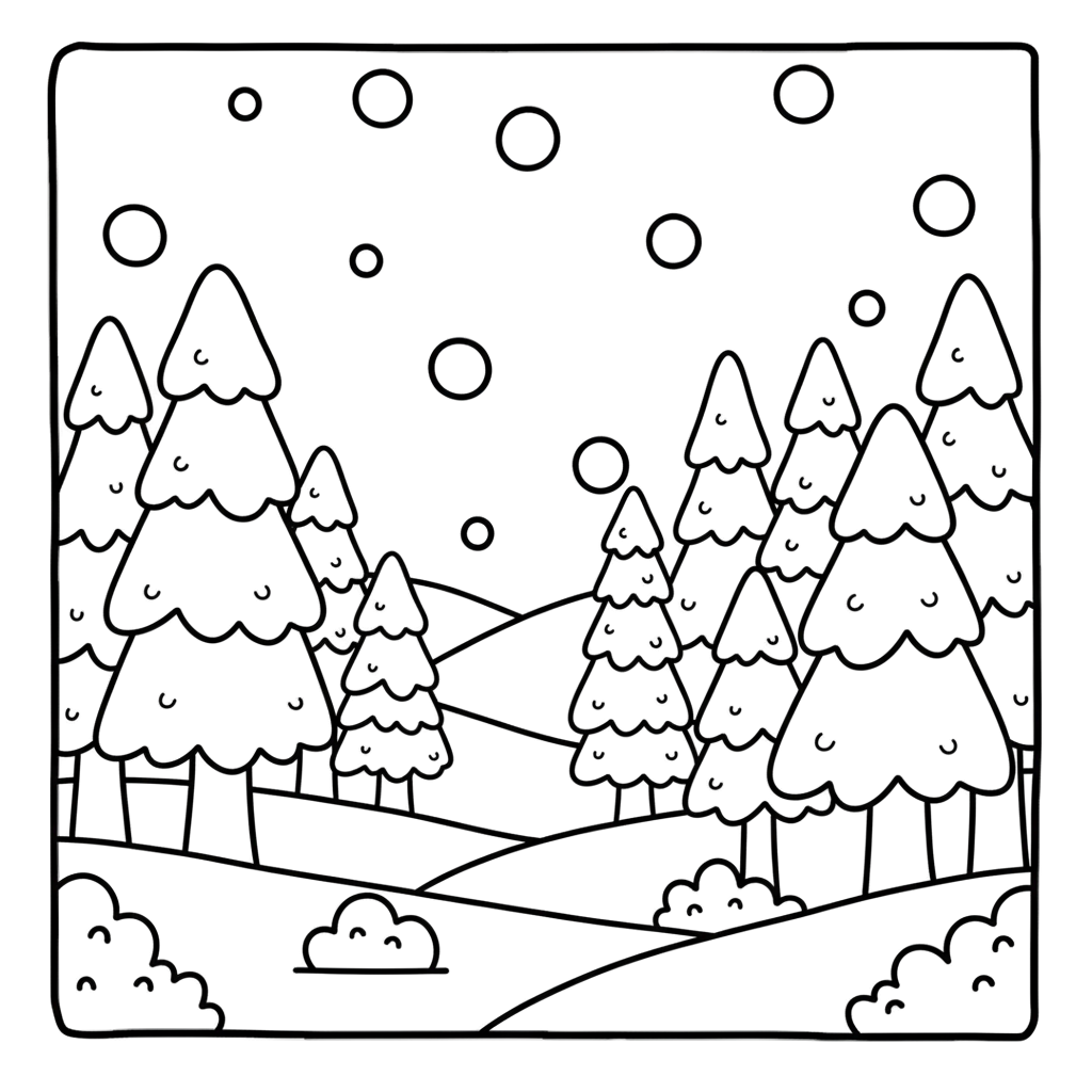 Bring the beauty of winter to life with this free printable forest coloring page, ready in SVG, PDF, and PNG formats for convenience. The design features tall snow-covered pine trees and gently falling snow, offering a relaxing and festive coloring experience for all ages.