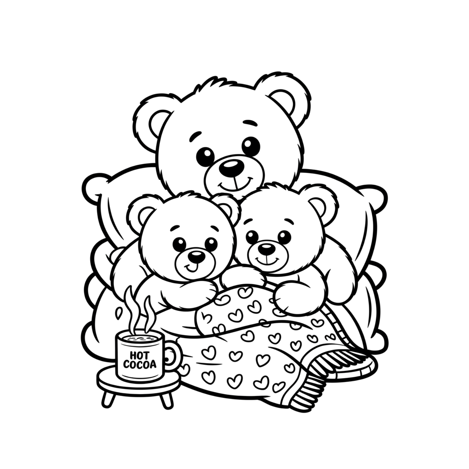 Teddy bears with cocoa coloring page in SVG, PDF, and PNG. A cozy family of bears sitting together with mugs of hot chocolate.