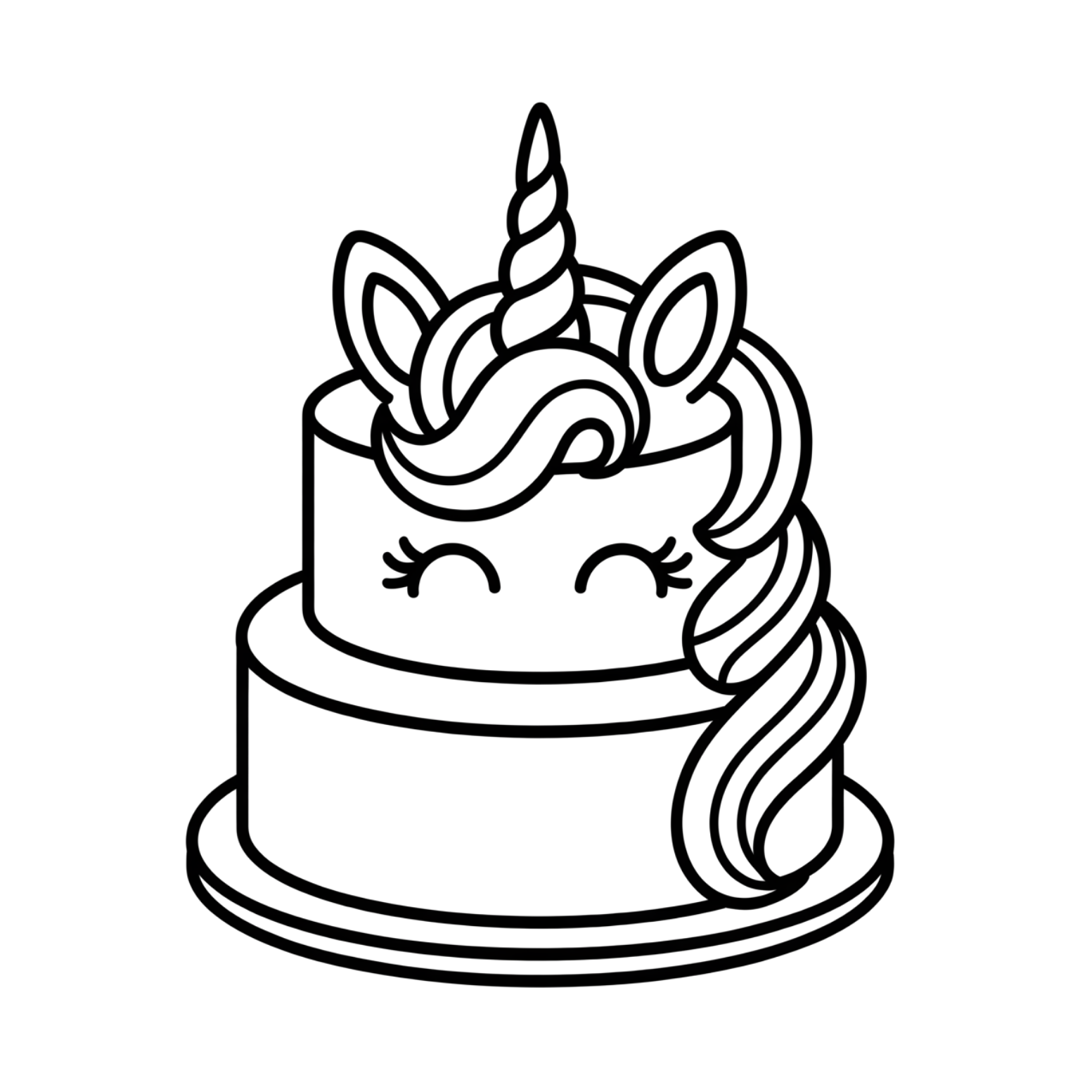 Unicorn cake coloring page in SVG, PDF, and PNG. A layered cake decorated with a unicorn face and mane, ideal for celebrations.